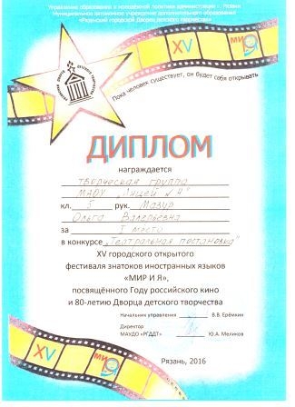 19 февраля 2016 года на лицейской сцене состоялась успешная премьера нового спектакля на английском языке по мотивам сказки американского писателя Лимана Фрэнка Баума «Волшебник страны Оз». Постановка была подготовлена творческим коллективом пятиклассников, посещающих театральный кружок на английском языке «В мире сказки» (руководитель Мазур Ольга Валерьевна). В этом учебном году коллектив принял участие в XV городском открытом фестивале знатоков иностранных языков «МИР И Я», посвященном Году российского кино, и занял 1 место в номинации «Театральная постановка». ПОЗДРАВЛЯЕМ!